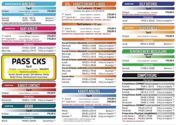 Cours, horaires et tarifs - Rentrée 2025/2026