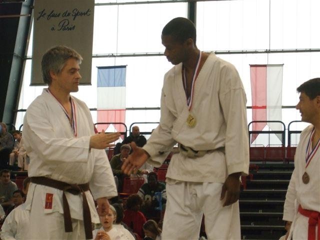 Philippe DUMONT a profité de cette montée à PARIS pour mettre les gants et faire la compétition Kumité (combat) dans la catégorie vétérans des ceintures marron et noires. Après un début bien négocié, notamment en quart de finale, maitrisé du début à la fin et gagné 3 à 1, le niveau est monté d’un cran. En demi-finale son adversaire lui a opposé une sérieuse résistance, le touchant lourdement à trois reprises, mais a surmonté l’obstacle 5 à 0 pour se hisser en finale. Après une courte pause, il devait échouer logiquement sur la dernière marche du podium face à un combattant un peu plus frais, mais surtout plus rapide et plus déterminer.