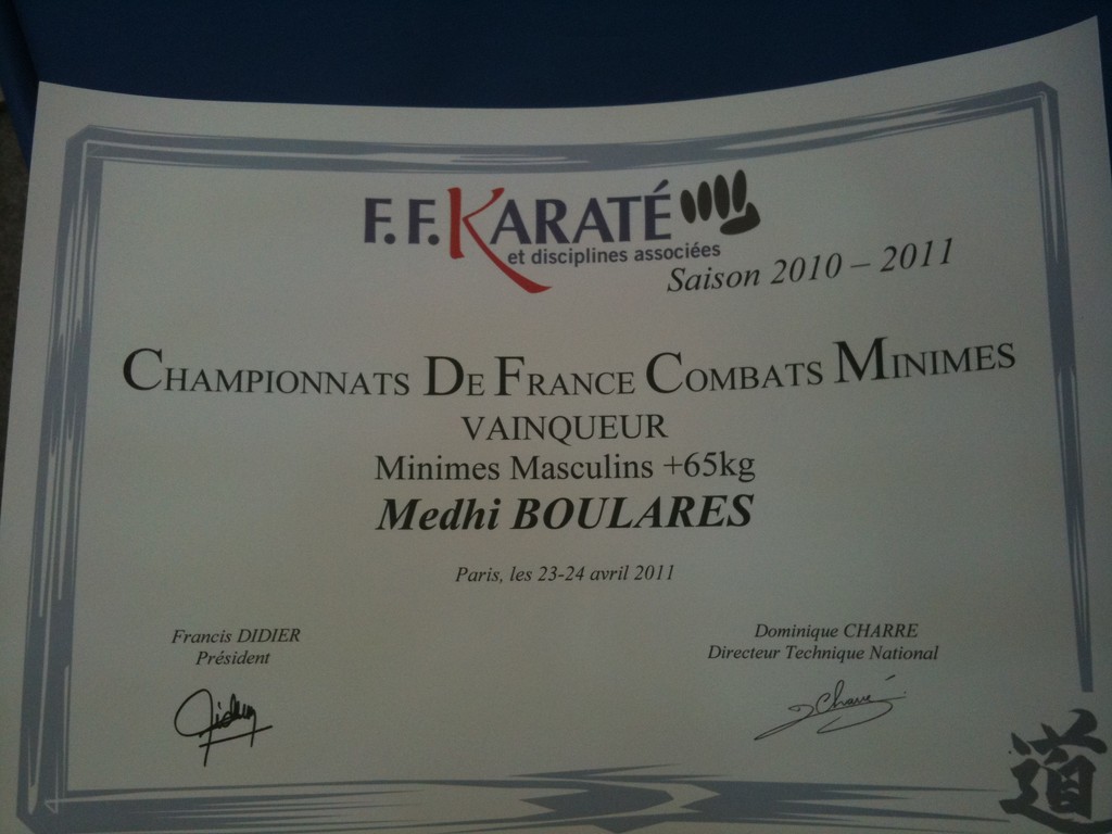 Après un très beau parcours Mr Boulares adhérent du CKS Coulommes/Bouleurs/Voulangis est devenu Champion de France 2011 dans la catégorie Minimes.
